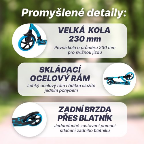 Kola jsou pevná a mají rozměr 230 mm. Koloběžka vám během jízdy zajistí komfort. Skládací řídítka mají gumové rukojeti pro pohodlné a bezpečné držení. Díky konstrukci z kvalitní odlehčené oceli se vám s ní dobře zachází.