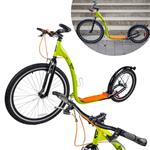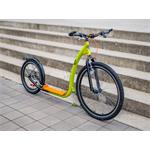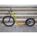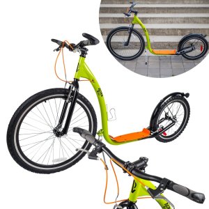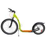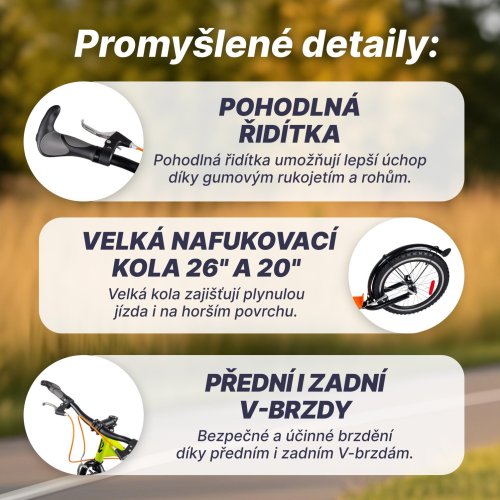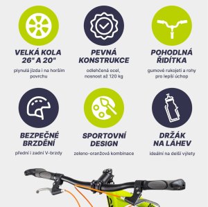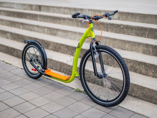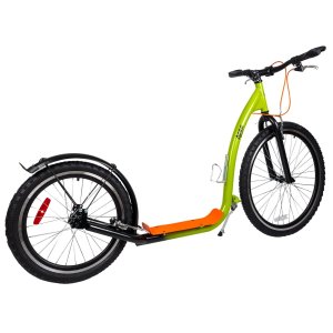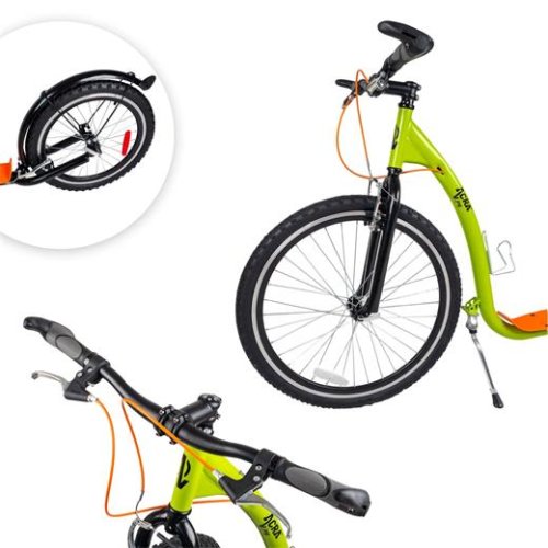 Koloběžka je vybavená účinnými V-brzdami. Řídítka s gumovými rukojeťmi a rohy se vám budou pohodlně držet. Mají výšku 95 cm a jsou pevná, koloběžka je tedy vhodná pro jezdce s maximální výškou postavy 190 cm. Jistě oceníte zadní blatník a bezpečnostní odrazky ve výpletech kol. Láhev si můžete odložit do praktického držáku, umístěného na rámu.