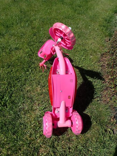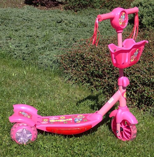 Koloběžka dětská, skládací, je určena od 3 let. Materiál je ocel + plast. Kolečka jsou plastová, o průměru - přední 15 cm a zadní 11 cm. Rozměry výrobku - 54 x 21 x 58 cm, délka stupátka, ( plocha pro nášlap nohy ), je 24 cm. Hmotnost koloběžky - 2,1 kg. Nosnost výrobku 30 kg. Motiv nálepek se může lišit.