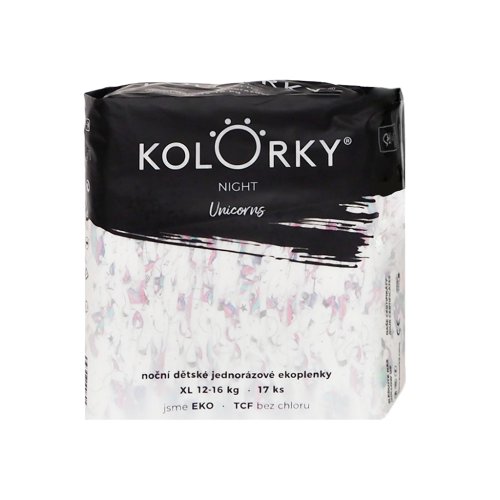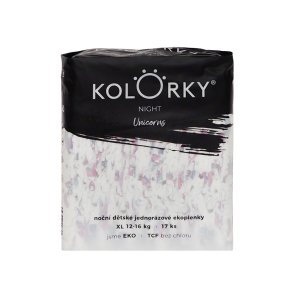 KOLORKY NIGHT mají zvýšenou absorpční vrstvu, díky které zůstane vaše miminko v suchu po celou noc. Indikátor vlhkosti vám přesně napoví, kdy je třeba miminko přebalit. Přírodní a obnovitelné materiály, ze kterých jsou vyrobeny, jsou šetrné k jemné pokožce miminek. Plenky jsou běleny horkým vzduchem zcela bez použití chloru metodou TCF (total chlorine free). Navíc mají originální design s jednorožci. Plenky jsou vyvinuty v ČR, dermatologicky testovány a certifikovány Státním zdravotním ústavem - SZÚ.