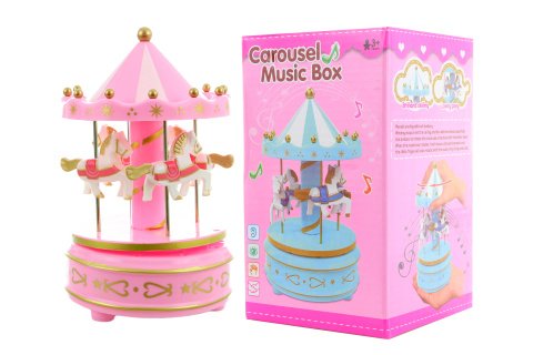 Hrající kolotoč. Po otočení kolotoče hraje melodie a točí. Velikost cca 11 x 11 x 18 cm. Baleno v krabičce. Není na baterie, funguje manuálně. Věk 3+