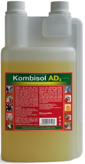Problém: Při nedostatku vitaminu A dochází k omezení sekrece ochranného hlenu v dýchacích cestách a střevech, což zvyšuje náchylnost k zánětu plic a střev. Následná porucha funkce epitelových buněk odpovídá funkci příslušných orgánů, kde se epitel nachází. Při nedostatku vitaminu D dochází ke snížení úrovně ukládání minerálních látek do rychle rostoucích kostí u mláďat, což vede k jejich deformaci nebo zvýšené lámavosti. U dospělých zvířat se nedostatek vitaminu D projevuje demineralizací kostí, což způsobuje měknutí (osteomalácie) nebo řídnutí (osteoporóza). U drůbeže způsobuje nedostatek vitaminu D špatnou kvalitu skořápek. Všechny tyto stavy značně ovlivňují parametry užitkovosti zvířat. Složení: vitamin A 50 000 m.j., vitamin D3 20 000 m.j. Způsob aplikace: Kombisol AD3 se přidává do pitné vody nebo mléka preventivně v doporučené dávce po dobu 5 – 10 dnů. Roztok je nutno připravovat denně čerstvý, chránit před přímým slunečním světlem a co nejrychleji spotřebovat. Nepodávat neředěný přípravek! Dávkování: