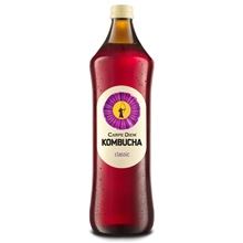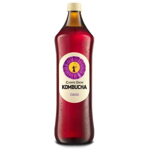 Kombucha, nápoj vyrobený z bylinného čajového nálevu, sycený, fermentovaný, tepelně ošetřený Směs malin a máty, třešní a citrusů s nádechem estragonu Baleno ve skleněné lahvi s objemem 0,75 l