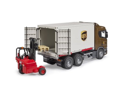 Pohodlné a robustní vozy BRUDER představují ve své nabídce řadu Scania Super R. Řada R se vyznačuje jedinečnou kombinací pohodlí a odolnosti. S novými modely od firmy BRUDER si děti mohou realisticky prožít různé situace. Společnost BRUDER nyní nabízí verzi se třemi nápravami, výměnnou nástavbou pro kontejnery a vysokozdvižným vozíkem. Řiditelný vysokozdvižný vozík s dvoudílným zvedacím stožárem, vychylováním lana, funkcí naklápění, nastavitelnou šířkou vidlic a pneumatikami s profilem. Kontejnerová nástavba tahače je demontovatelná na všechny jednotlivé díly a v zadní části má výklopné dveře. Další výjimečnou vlastností tohoto vozidla je výměnná nástavba, která se automaticky odpojí od vozidla vytažením a nastavením opěrných nohou a zvedne kontejner, čímž umožní nákladnímu vozidlu vyjet zpod výměnné nástavby. Nová kabina se vyznačuje typickým dynamickým designem nové řady R značky Scania. Samozřejmostí jsou sklopná vnější zrcátka a zasklení z vysoce kvalitního polykarbonátu, otevírací dveře a možnost doplnění světelného a zvukového modulu. Vyrobené z vysoce kvalitních plastů, jako je ABS. Měřítko 1:16. Lze použít pro hru uvnitř i venku. Rozměry auta: 26,5 x 18,5 x 53,5 cm. Rozměry balení: 29 x 20,5 x 71 cm. Věk: 4+