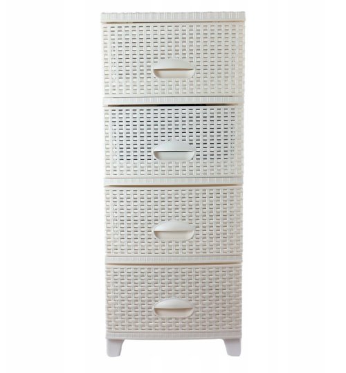 4 patrová komoda vyrobená z plastové elegantní imitace ratanu. Vhodná do koupelny, dětského pokoje. ložnice, garáže, dílny, skladu apod. kamkoli, kde je klíčový pořádek a styl! Zesílená konstrukce – zvýšená stabilita, trvanlivost a odolnost. Pevný materiál – odolný vůči vlhkosti, bez zápachu a snadno se čistí. Ratanový styl – přírodní vzhled, který doplní jakýkoli interiér. Lehká a praktická – snadno se přenáší kamkoli. Samostatná montáž – vše, co potřebujete, je součástí balení! Rozměry komody 37.5 x 44.5 x 94 cm. Barva bílá. EAN 8697806191326 / 0000040690605