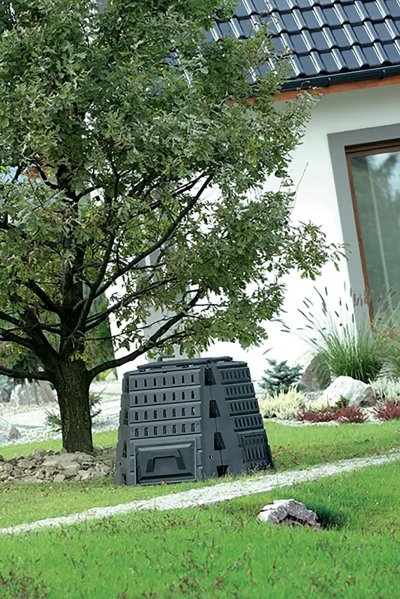 900l kompostér BIOCOMPO v černé barvě je odolný vlivům počasí.