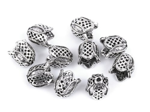 Kovový kaplík ve tvaru květu můžete využít jako zajímavý a oživující prvek v široké škále výrobků. Je vhodný jako koncovka na oděvní šňůrky. Má skvělé využití jako sukýnka na výrobu malých bižuterních andělů. Průvlek horní 2 mm, spodní 7,5 mm, výška 12 mm.