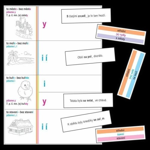 340 kartiček k procvičování psaní I, Í, Y, Ý v koncovkách podstatných jmen.Součástí je i 1 sada podložek - Koncovky pod. jmen - podložka.K sebekontrole je určena barevná strana.