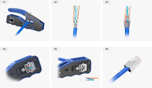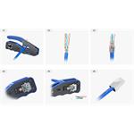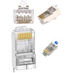 Průchozí datový konektor Wire Cross RJ45 využijete pro strukturovanou kabeláž vodiče typu drát. Má stínění FTP a spadá do třídy CAT5E. Zapojení 8P8C zajišťuje rychlé a snadné krimpování konektoru na datový kabel. Všech 8 vodičů protáhnete skrz konektor, nakrimpujete a ostrým břitem v rukojeti krimpovacích kleští zaříznete přebytečnou délku. Vodič má tak vždy správný kontakt s pinem. Velkou výhodou je také to, že máte dokonalý přehled o pořadí vodičů. Těšit se můžete na výdrž až 1 000 zapojení.