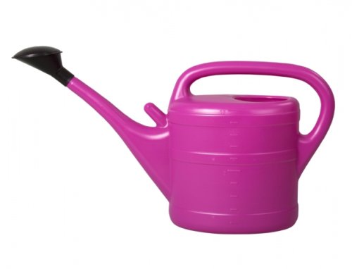 Růžová plastová konev s černým kropítkem. Je vhodná na zalévání pokojových, balkónových i zahradních květin. Možný výběr z několika barevných variant. Obsah je 10 litrů.