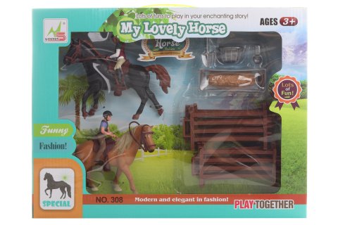 Sada koníků s doplňky. Balení obsahuje 2 koně, 2 jezdce, ohradu a další doplňky. Rozměry balení cca 37 x 28,5 x 5,5 cm. Věk 3+