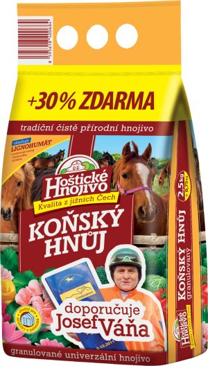 Koňský hnůj je čistě přírodní organické hnojivo. Lignohumát vylepšuje kvalitativní vlastnosti samotného hnoje o huminové látky a mikroprvky. Složení: základní živiny: 1,5N + 2P + 2K +Ca + Mg, mikroprvky : Fe, Mn, Mo, Zn, Cu. Aplikace: rozhozem s jemným zapravením do vrchní vrstvy půdy. Granulované pelety ve styku s vodou bobtnají a postupně uvolňují živiny. Koňský hnůj se hodí zejména pro rostliny velmi náročné na výživu (např.: celer, květák, kapusta, plodová zelenina). Přirozeně zvyšuje podíl humusu v půdě, neobsahuje klíčivá semena plevelů. Balení: 2,5 kg.