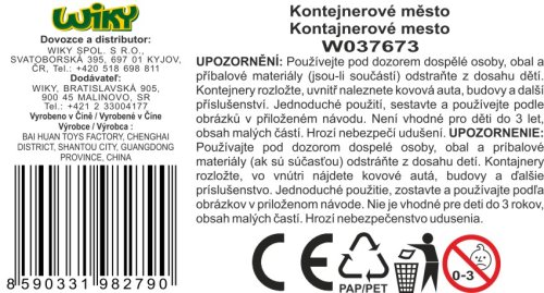Kontejnerové město - 6 kontejnerů. Velikost kontejneru 12,5 cm, auta 7 cm. Obsahuje 6 kontejnerů, 6 kovových aut s volnými koly. Každý kontejner obsahuje 1 kovové auto, 2 budovy, 2 pouliční lampy, semafor, ulici, 2 figurky, polepy, obrázkový návod na sestavení.
