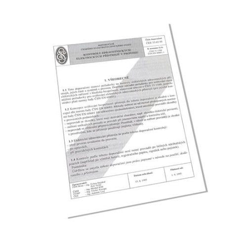 V souvislosti s rozvojem elektroniky a výpočetní techniky došlo v uplynulých letech také ke značnému nárůstu používání elektrických zdravotnických přístrojů. Při provádění kontrol běžných elektrických spotřebičů a nezdravotnických přístrojů lze postupovat dle Doporučení ČES 33.03.94 "Kontroly elektrických spotřebičů a pohyblivých přívodů během jejich používání". Doporučení ČES 33.03.95 stanoví požadavky na kontroly elektrických zdravotnických přístrojů, jejich částí a systémů v provozu. Doplňuje základní požadavky na ověřování stavu elektrických zařízení z hlediska bezpečnosti, které jsou obecně stanoveny v ČSN 33 1500, podrobnějšími požadavky na ověřování elektrických zdravotnických přístrojů. Koncepce ověřování bezpečnosti přístrojů je podle tohoto doporučení shodná s koncepcí podle norem řady ČSN EN 60 601. Doporučení ČES 33.03.95 je nezbytným normativním podkladem pro provádění kontrol zdravotnických elektrických přístrojů v provozu jak u zdravotnických a jiných podniků, které tyto spotřebiče provozují, tak u firem, které jejich kontroly provádějí dodavatelským způsobem. Obsah 1. Všeobecně 2. Termíny a definice 2.1 Přístupná část 2.2 Ochranná uzemňovací svorka 2.3 Ochranný uzemňovací vodič 2.4 Funkční uzemňovací svorka 2.5 Funkční uzemňovací vodič 2.6 Odpor ochranného vodiče 2.7 Vodič pro vyrovnání potenciálů 2.8 Příslušenství 2.9 Odpojitelný síťový přívod 2.10 Konektor přístroje 2.11 Unikající proud 2.12 Rozdílový proud 2.13 Stav jedné závady 2.14 Přístroj typu B 2.15 Příložná část typu F 2.16 Přístroj typu BF 2.17 Přístroj typu CF 2.18 Zdravotnický elektrický systém 2.19 Zdravotnický elektrický přístroj 2.20 Pevně připojený přístroj 2.21 Elektrická instalace 2.22 Průvodní dokumentace 2.23 Uživatel 3. Lhůty a postupy kontrol 3.1 První měření 3.2 Kontroly po opravách 3.3 Pravidelné kontroly 4. Postupy kontrol 5. Prohlídka 6. Odpor ochranného uzemňovacího vodiče 6.1 Přístroje třídy ochrany I připojené pohyblivým přívodem s vidlicí 6.2 Pevně připojené přístroje třídy ochrany I 7. Unikající proudy 7.1 Všeobecně 7.2 Měření unikajícího proudu síťová část - přístupné části 7.3 Měření unikajícího proudu síťová část - přiložená část 7.4 Měření unikajícího proudu příložná část - přístupné části 7.5 Zdravotnické elektrické systémy 7.6 Měřicí přístroje 8. Doklady o kontrole 9. Závěrečná ustanovení
