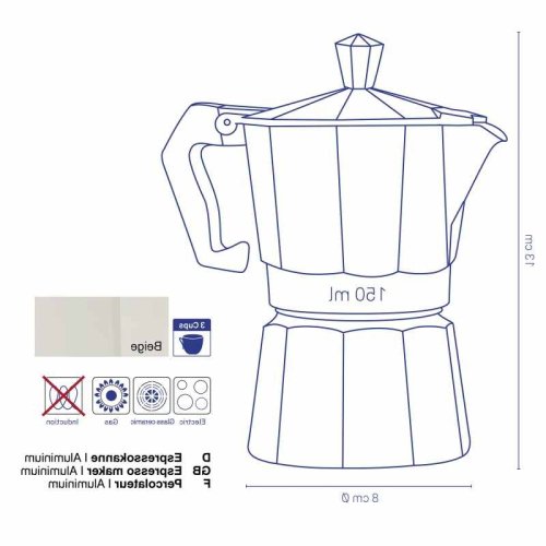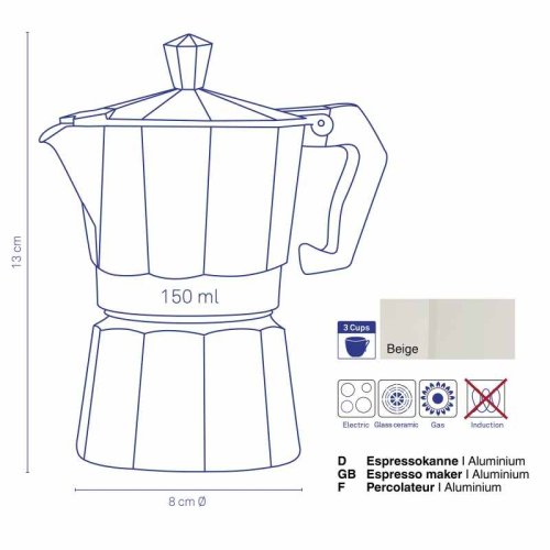 Klasika mezi kávovary: konvička na espresso ITALIA vyrobená z hliníku v béžové barvě. Příprava espressa nemůže být snazší: nalijte vodu a kávu do konvice na espresso ITALIA, položte na sporák a za chvíli je espresso hotové: se správným aroma kávy, horké a lahodné. Na 3 šálky (150 ml). Vhodné na elektrický sporák, sklokeramickou desku, plynový sporák, sálavé.Hliník 8cm, 13cm v na 3 šálky