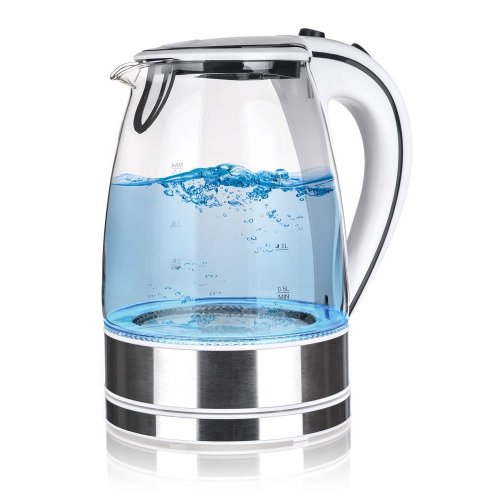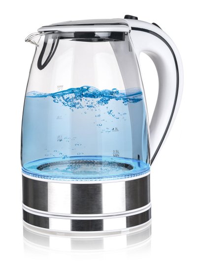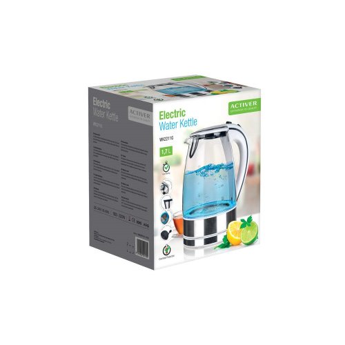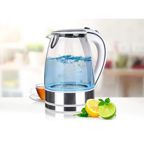 Moderní varná konvice s plochým dnem a skleněným tělem, o objemu 1,7 l, je nedílnou součástí každé kuchyně. Při provozu je obsah konvice osvícený vestavěnými LED diodami, podtrhující celkový luxusní vzhled konvice. Konvice je vybavena ochranou proti přehřátí, má základnu se středovým konektorem - volně otočný o 360 stupňů, vyjímatelný, omyvatelný filtr a automatické / manuální vypnutí.