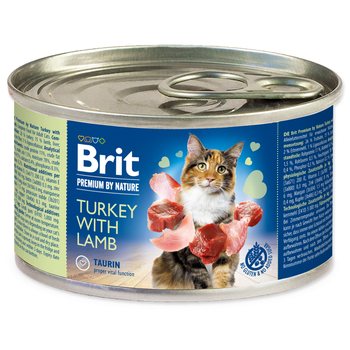 Konzervy Brit Premium by Nature doplňují řadu suchých krmiv Brit Premium a nabízí tak chovatelům další alternativu ve stravování jejich koček. Konzervy mají formu velmi jemného a krémového paté, vyrobeného z přírodních surovin s ohledem na prospěšnost pro zdraví koček. Složení: krůta 26 %, jehně 15 %, játra, hrachová mouka 2 %, lignocelulóza 1 %. Analytické složky: hrubý protein 11 %, hrubé oleje a tuky 4,5 %, hrubý popel 1,5 %, vlhkost 78 %, hrubá vláknina 0,5 %, vápník 0,4 %, fosfor 0,3 %, sodík 0,2 %. Nutriční doplňkové látky v 1 kg: vitamin D3 (3a671) 200 m.j., vitamin E (3a700) 100 mg, biotin (3a880) 0,3 mg, zinek (3b606) 8 mg, železo (3b106) 6 mg, mangan (3b504) 1,5 mg, jodid draselný (3b201) 0,4 mg, měď (3b406) 0,3 mg, taurin (3a370) 500 mg. Metabolizovatelná energie: 1 010 kcal/kg