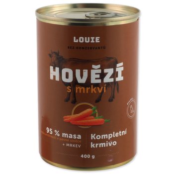 Kompletní krmivo pro psy všech plemen bez rozdílu věku. Šťavnatá konzerva obsahující 95 % mletého hovězího masa v pevné složce. Kromě masa je v konzervě 5 % rostlinné složky suplující obsah žaludku býložravé kořisti ve volné přírodě. Mrkev dodává psům potřebné živiny a minerály a postará se o vstřebání šťávy, kterou maso během sterilace uvolní. Nemusíte se proto bát, že když byl váš pejsek zvyklý na granule, budete běhat na procházky častěji než obvykle.