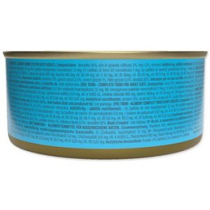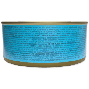 | Složení | Tuňák 55 %, rýže 1,5 %, rafinovaný slunečnicový olej 2 %, minerály. |