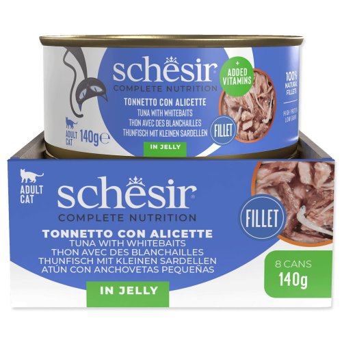 Konzerva s masem z tuňáka se sleděm v želé. Doplňkové krmivo pro dospělé kočky.