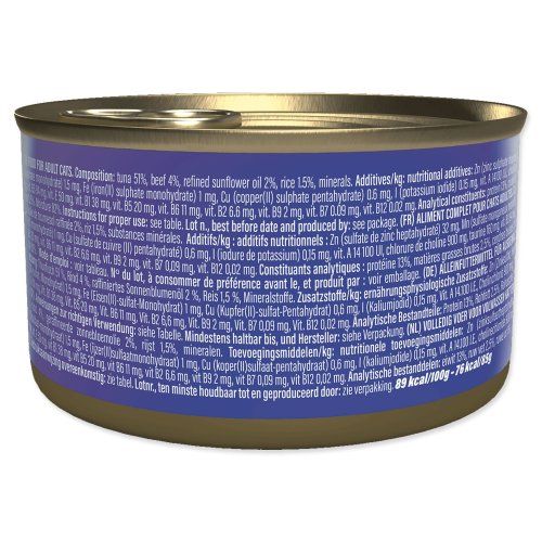 | Složení | Tuňák 51 %, hovězí filetky 4 %, rýže 1,5 %, rafinovaný slunečnicový olej 2 %, minerály. |