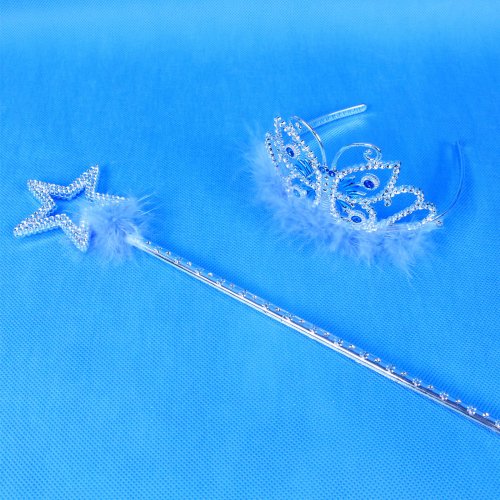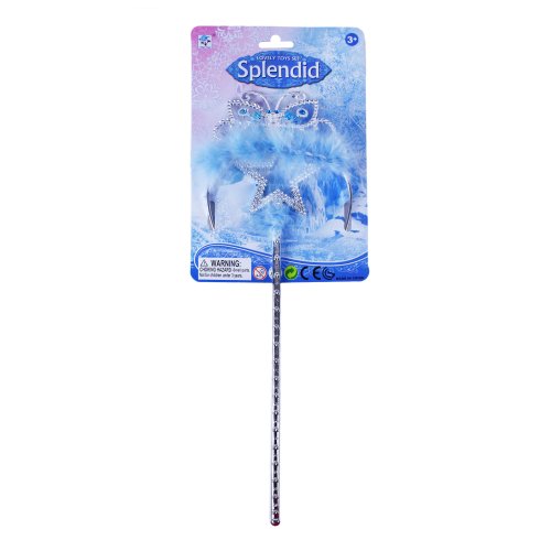 Exkluzivní sada pro zimní princezny! Tato stylová souprava stříbrné barvy obsahuje oslnivou korunku s modrými kamínky a žezlo. Vše je dekorováno ozdobným peřím modré barvy. Obohať svůj kostým zimní princezny o tyto nádherné doplňky!