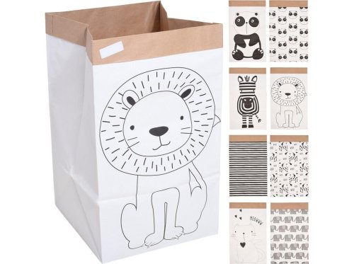 sada obsahuje 2 koše rozměry: 45 x 28 x 28 cm (S), 50 x 30 x 30 cm (L) materiál: papír s černotiskem mix 4 dekorů sada obsahuje 2 různé dekory