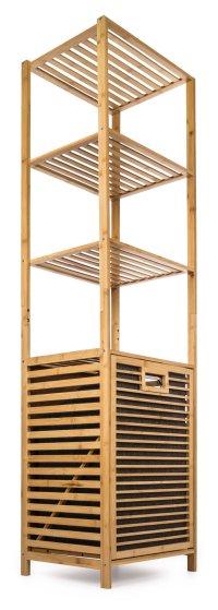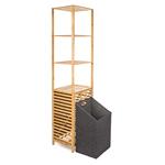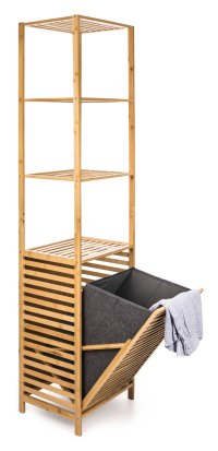 Praktický stojan se 4 policemi a výklopným košem na prádlo je skvělým řešením. Ušetří spoustu místa a uložíte do něj vše, co potřebujete. Potřeby na praní nebo kosmetiku, koupelnové vybavení a ručníky nebo úklidové prostředky. Každá z polic unese až 10 kg zátěže. Jedna z nich tvoří zároveň víko koše na špinavé prádlo s látkovou vložkou ve spodní části stojanu.