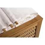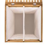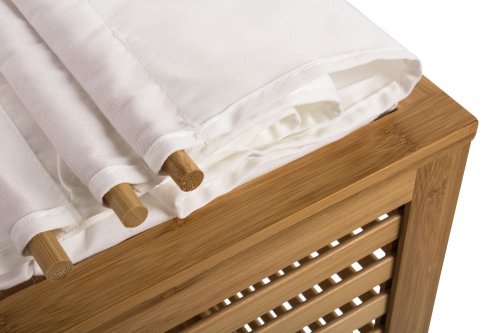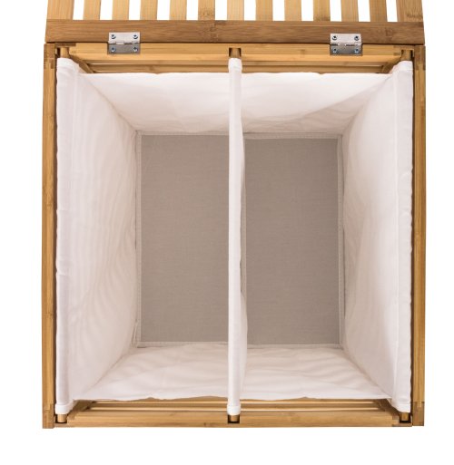 Bambusový koš G21 s pevným víkem má pratelnou látkovou vložku, rozdělenou na dva samostatné oddíly. Špinavé prádlo tak můžete třídit už před praním a umístit zvlášť kousky podle materiálu nebo barvy.