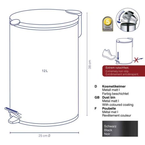 Pedálový koš Mats v černé barvě s matnou povrchovou úpravou spojuje moderní design s praktičností. Díky systému tichého zavírání se víko zavírá plynule a nehlučně. Protiskluzová základna navíc zajišťuje maximální stabilitu při každodenním používání.