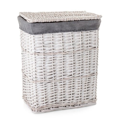 Velký proutěný koš na prádlo. Vnitřek koše je podšitý bavlněným plátnem. Má kryt připevněný ozdobnými pásky podobnými kůži. Objem 65 litrů, rozměry 41 x 31 x 50 cm. EAN 5901812359469