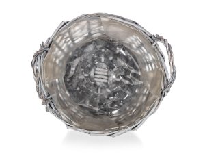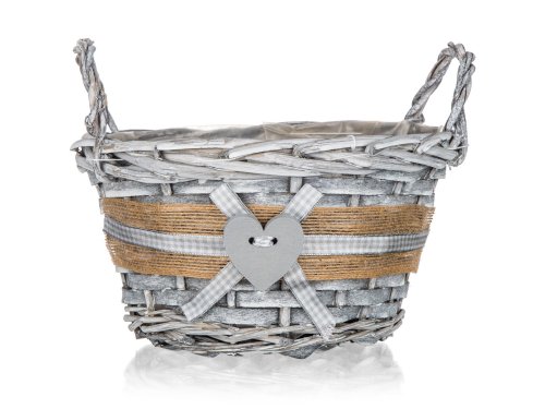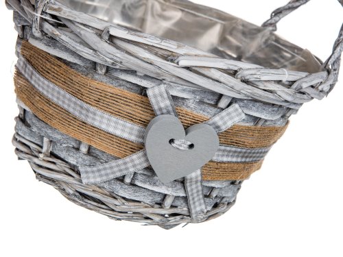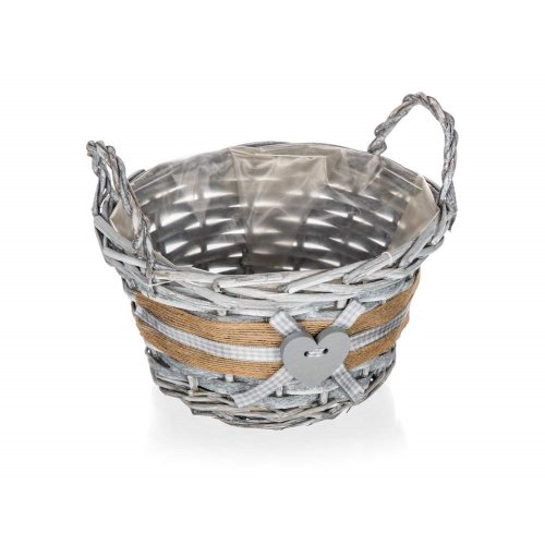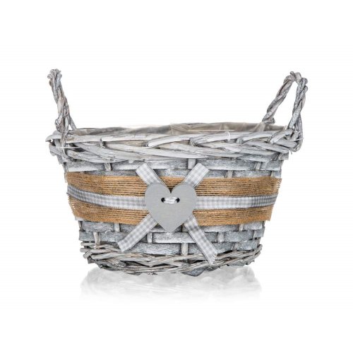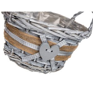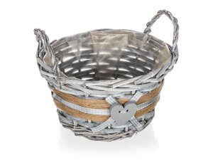 Košík proutěný s uchy je vhodný pouze pro dekorativní účely. Dodáván v šedé barvě kulatého tvaru s dekorem srdce, uvnitř igelit.