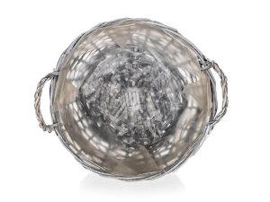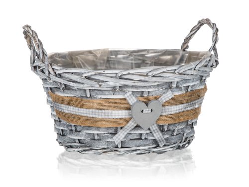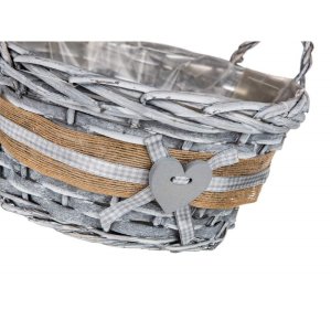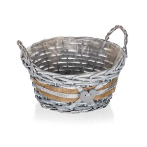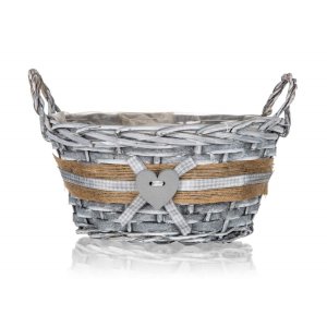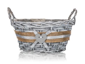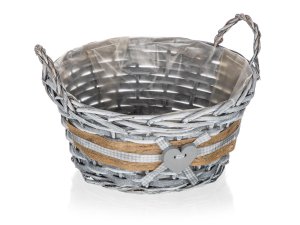 Košík proutěný s uchy je vhodný pouze pro dekorativní účely. Dodáván v šedé barvě kulatého tvaru s dekorem srdce, uvnitř igelit.