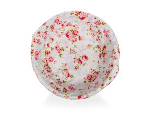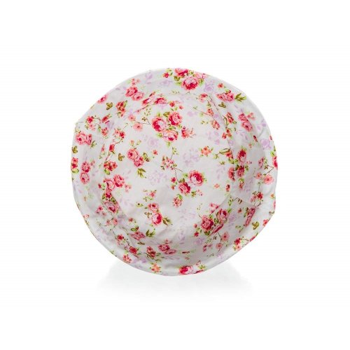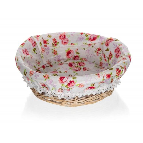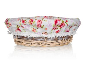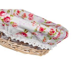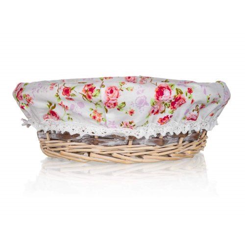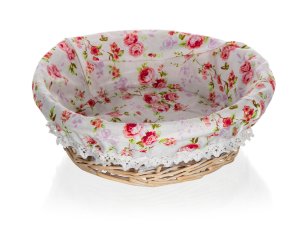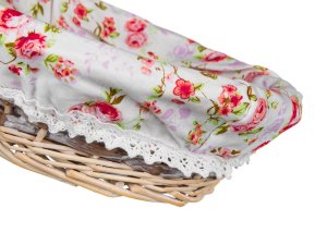 Proutěný košík ROSES je vhodný pouze pro dekorativní účely. Dodáván v hnědobílé barvě kulatého tvaru, uvnitř bavlněná látka s dekorem růží a krajkovým lemem.