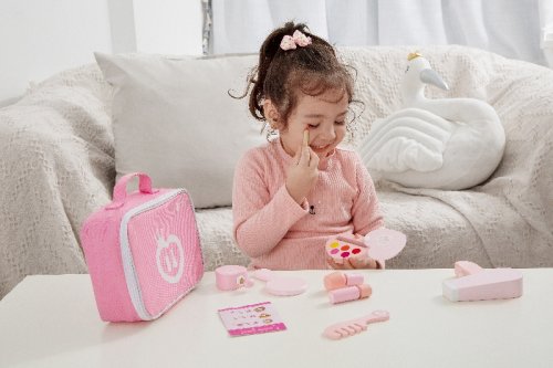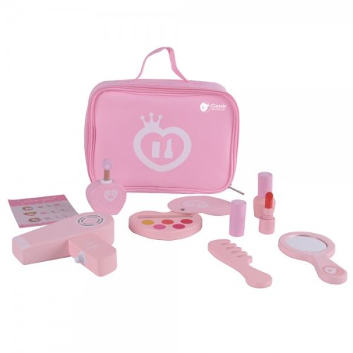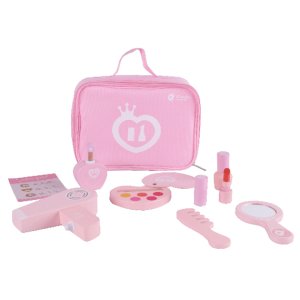 S touto dřevěnou make-up sadou máte vždy vše po ruce, abyste byla krásná. Věci snadno přenesete ve veselé růžové taštičce. Kosmetická taštička s doplňky pro líčení je ideální hračkou pro malou princeznu. Tato sada pomáhá podporovat rozvoj dětské představivosti a také rozvíjí jemnou motoriku. Rozměr balení: 21 x 7,5 x 16 cm Vhodné pro děti od 3 let
