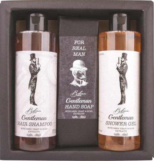 Dárkové balení kosmetiky pro muže gentlemana obsahuje sprchový gel 250 ml, toaletní mýdlo 145 g a vlasový šampon 250 ml s extrakty z pivních kvasnic a chmele. Originální kosmetický dárek pro muže.