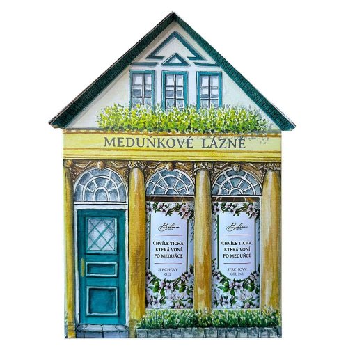 Kosmetická sada Meduňkové lázně obsahuje sprchový gel 100 ml a sprchový gel 2v1 100 ml s extraktem meduňky. Dárkový obal má tvar domečku s originální grafikou ručně kreslenou naším kolegou – jde o autentické dílo, které dodává celé sadě osobitý charakter.