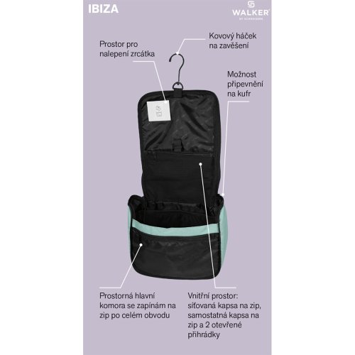 •   prostor pro nalepení zrcátka pomocí samolepicí etikety a suchého zipu, *   kovový háček na zavěšení, *   rukojeť pro snadnější přenášení, *   možnost připevnění na kufr pomocí zadního popruhu na zip, který lze případně využít také jako další kapsu, *   kosmetická taška z voděodolného materiálu Ripstop, *   materiál z 50 % z recyklovaného polyesteru vyrobeného z recyklovaných PET lahví, *   materiál s impregnací proti vodě a špíně,  , Tip: Kosmetickou tašku si můžete barevně sladit s praktickými doplňky jako je kufr, cestovní taška nebo ledvinka.