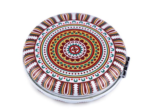 Kulaté otevírací zrcátko je výborný pomocník pro opravu make-upu během dne. Skvěle se vejde do každé dámské kabelky. Má kvalitní zpracování z eko kůže s dekorem mandaly. Uvnitř jsou 2 zrcátka, jedno je zvětšovací. Náš tip: zrcátko bude krásným malým dárkem na valentýna či k jiným příležitostem. Zrcátka v balení mix 12 ks jsou zabalená v papírové krabici. Uvnitř má stojánek, hodí se k vystavení do prodejny, viz foto. Krabice má rozměry 12 x 24 x 9 cm.