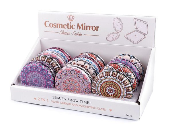 Kulaté otevírací zrcátko je výborný pomocník pro opravu make-upu během dne. Skvěle se vejde do každé dámské kabelky. Má kvalitní zpracování z eko kůže s dekorem mandaly. Uvnitř jsou 2 zrcátka, jedno je zvětšovací. Náš tip: zrcátko bude krásným malým dárkem na valentýna či k jiným příležitostem. Zrcátka v balení mix 12 ks jsou zabalená v papírové krabici. Uvnitř má stojánek, hodí se k vystavení do prodejny, viz foto. Krabice má rozměry 12 x 24 x 9 cm.
