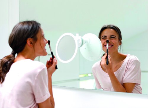 Toto kosmetické zrcátko vám usnadní každodenní péči o obličej. Je vybaveno osvětlenou zrcadlovou plochou s 5násobným zvětšením. Tuto plochu lze pomocí teleskopického držáku natočit do požadované polohy. Neoslnivé osvětlení v rámu složené z bílých LED diod lze zapnout a vypnout tím, že se krátce dotknete dotykové plochy. Přísavka se vyznačuje silnou přilnavostí ke všem hladkým povrchům.