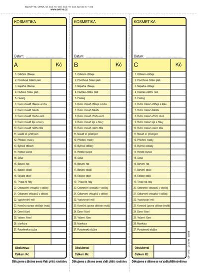 Blok pro kosmetická studia s karbonovou (propisovací) vrstvou, 100 listů, každý list má tři části, formát A5, nečíslovaný Formát:A5 Samopropisovací:Ano Číslovaný:Ne Počet listů:100
