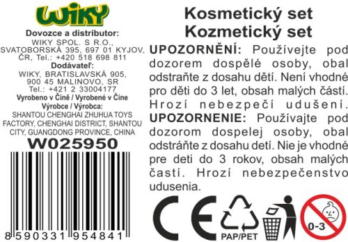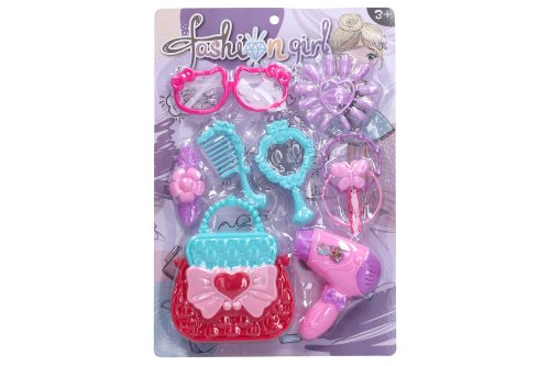 Kosmetický set. Součástí brýle, nehty, hřeben, zrcátko, náramky, kabelka, fén a další.