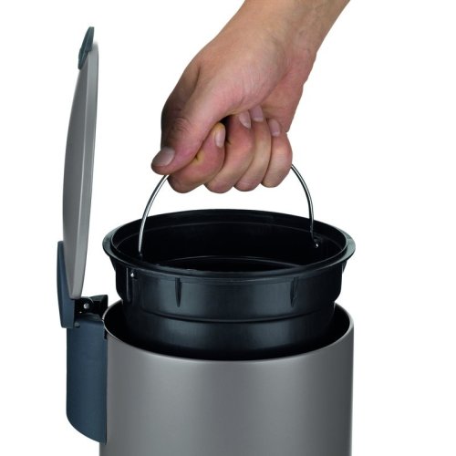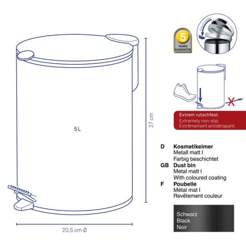 • volně stojící kosmetický koš z oceli- má vyjímatelnou vnitřní nádobu, díky které se snadno udržuje- jistě oceníte SoftClose tiché a plynulé zavírání víka- protiskluzová úprava dna zajistí stabilitu koše- matný vnější povrch- pedálové i ruční otevírání víka- objem 5 litrů- rozměry: výška 27 cm, průměr 20,5 cm- barva: černá