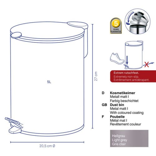 • volně stojící kosmetický koš z oceli- má vyjímatelnou vnitřní nádobu, díky které se snadno udržuje- jistě oceníte SoftClose tiché a plynulé zavírání víka- protiskluzová úprava dna zajistí stabilitu koše- matný vnější povrch- pedálové i ruční otevírání víka- objem 5 litrů- rozměry: výška 27 cm, průměr 20,5 cm- barva: šedá