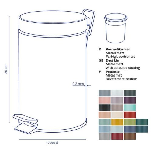 Pro menší odpad v kuchyni nebo koupelně: kovový pedálový koš s matným povrchem v kari žluté. Guma na spodní straně zajišťuje pevný stoj.Vnitřní vědro je vyrobeno z černého plastu a má praktické ucho na přenášení. Odpadkový koš je vysoký 26 cm a má průměr 17 cm. objem 3l. Kov s práškovým nástřikem matný 3L, 17cm , 26cm v