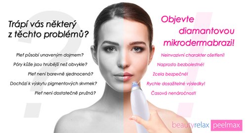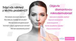 Kosmetický přístroj na abrazi pleti BeautyRelax Peelmax. Jste připravena omezit používání make-upu? Objevte své skutečné já! Přístroj na diamantovou mikrodermabrazi vám přináší ošetření pleti profesionální technologií přímo k vám domů! Aplikace je neinvazivní a zcela bezbolestná. Celková doba ošetření trvá pouhých pár minut! Pokud je odpověď alespoň v jednom případu ano, máme pro vás řešení! Stres, nesprávný spánkový režim, nevyvážená strava, držení neustálých diet, působení nečistot v ovzduší. Jedny z mnoha faktorů, které mají nezanedbatelný vliv na tvorbu akné, vrásek, výskyt pigmentových skvrn a celkovou ztrátu pružnosti pleti. Zdroj celé řady kožních problémů lze nalézt v nedostatečné péči o pleť v období dospívání a období kolem dvacátého roku života. Nic však není ztraceno! Diamantová mikrodermabraze je účinným nástrojem, který působení negativních vlivů na pleť výrazně eliminuje. Hýčkejte svoji pleť jako v profesionální estetické klinice! Zpětná vazba uživatelek na dotaz, jaký měli pocit při krátkodobém používání diamantové mikrodermabraze: