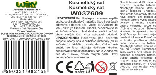 Kosmetický set s fénem. Velikost fénu 13cm. Obsahuje: fén, kulmu, kulatý kartáč na vlasy, zrcátko, klíče od auta, flakónky, rtěnku. 1xAA baterie není součástí.