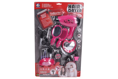 Kosmetický set s fénem. Velikost fénu 14cm. obsahuje: fén, hřeben, zrcátko, nůžky, zrcátko na postavení, sadu štětců. 2xAAA baterie nejsou součástí.
