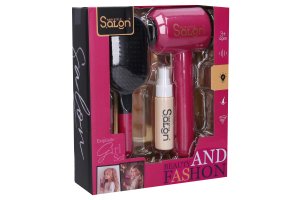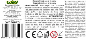 Kosmetický set s fénem. Velikost 21cm. Obsahuje kartáč na vlasy, fén, sprej. Baterie 2xAA nejsou součástí. Funkční fén. Fén se zapíná tlačítkem.